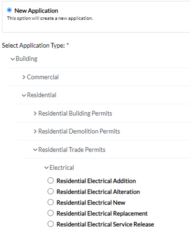 Click "New Application" then select the "Building" drop down.