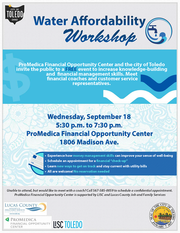 The ProMedica Financial Opportunity Center and the city of Toledo will hold a free water affordability workshop, 5:30 to 7:30 p.m., Wednesday, Sept. 18 at 1806 Madison Ave. The session will help attendees: