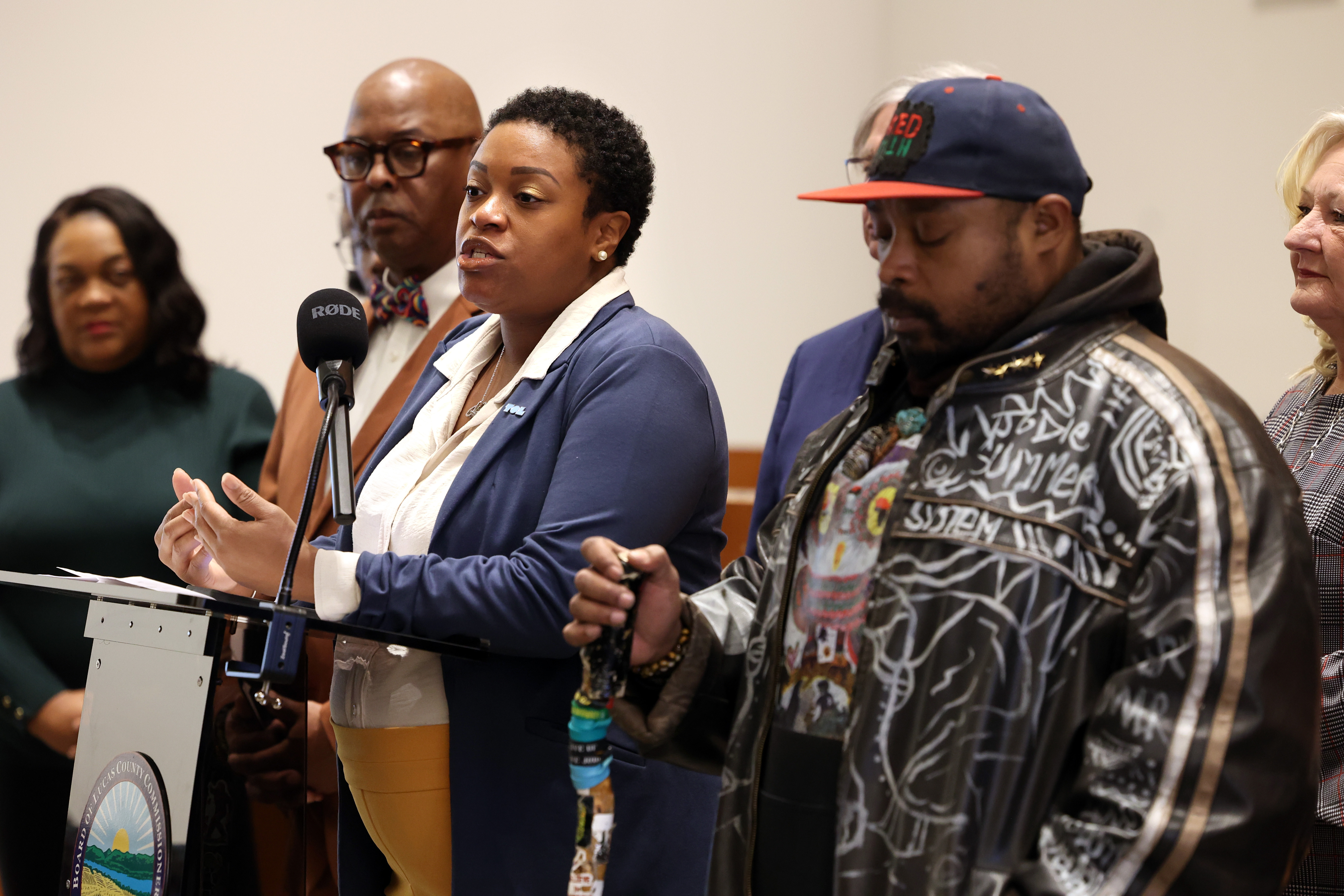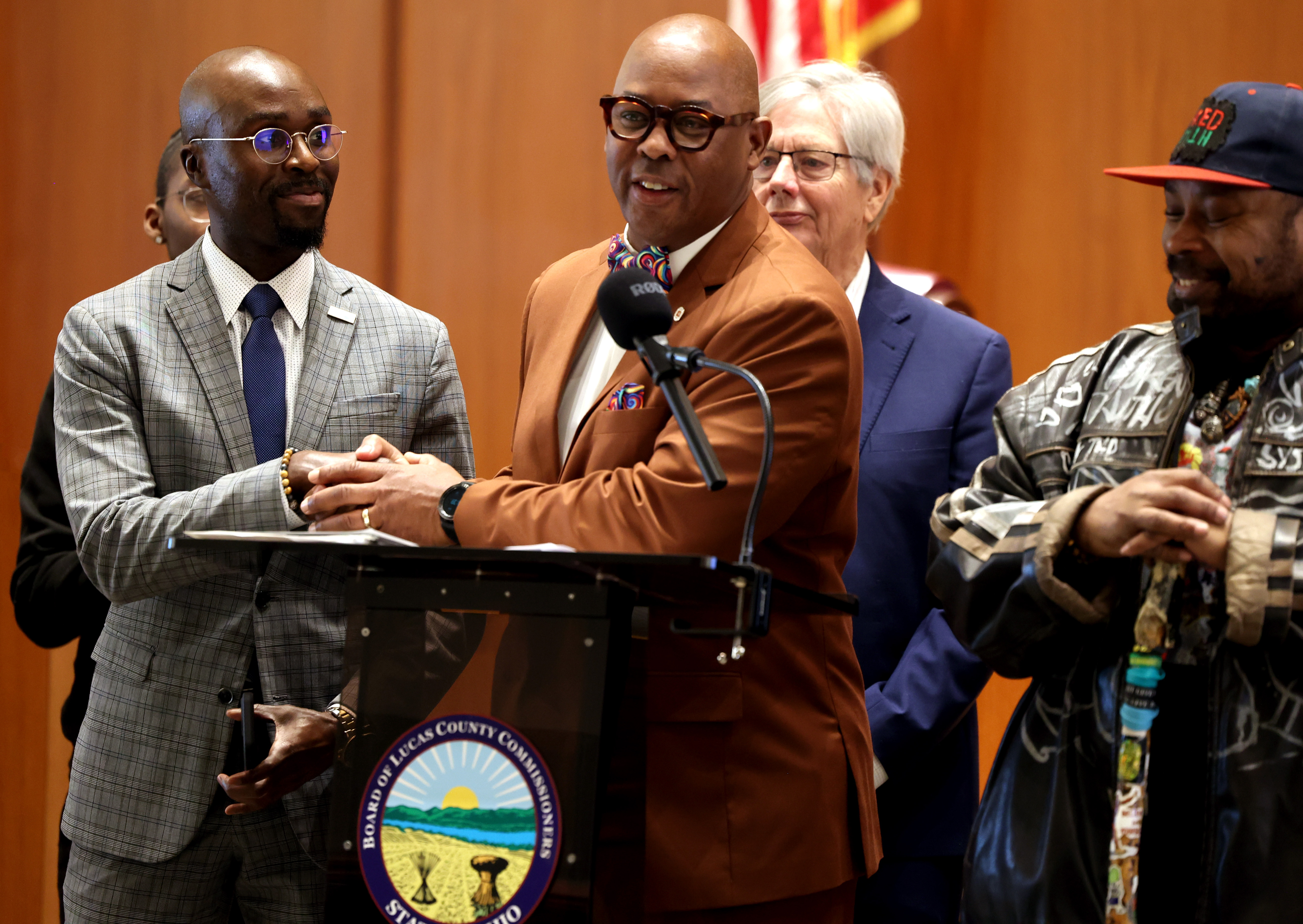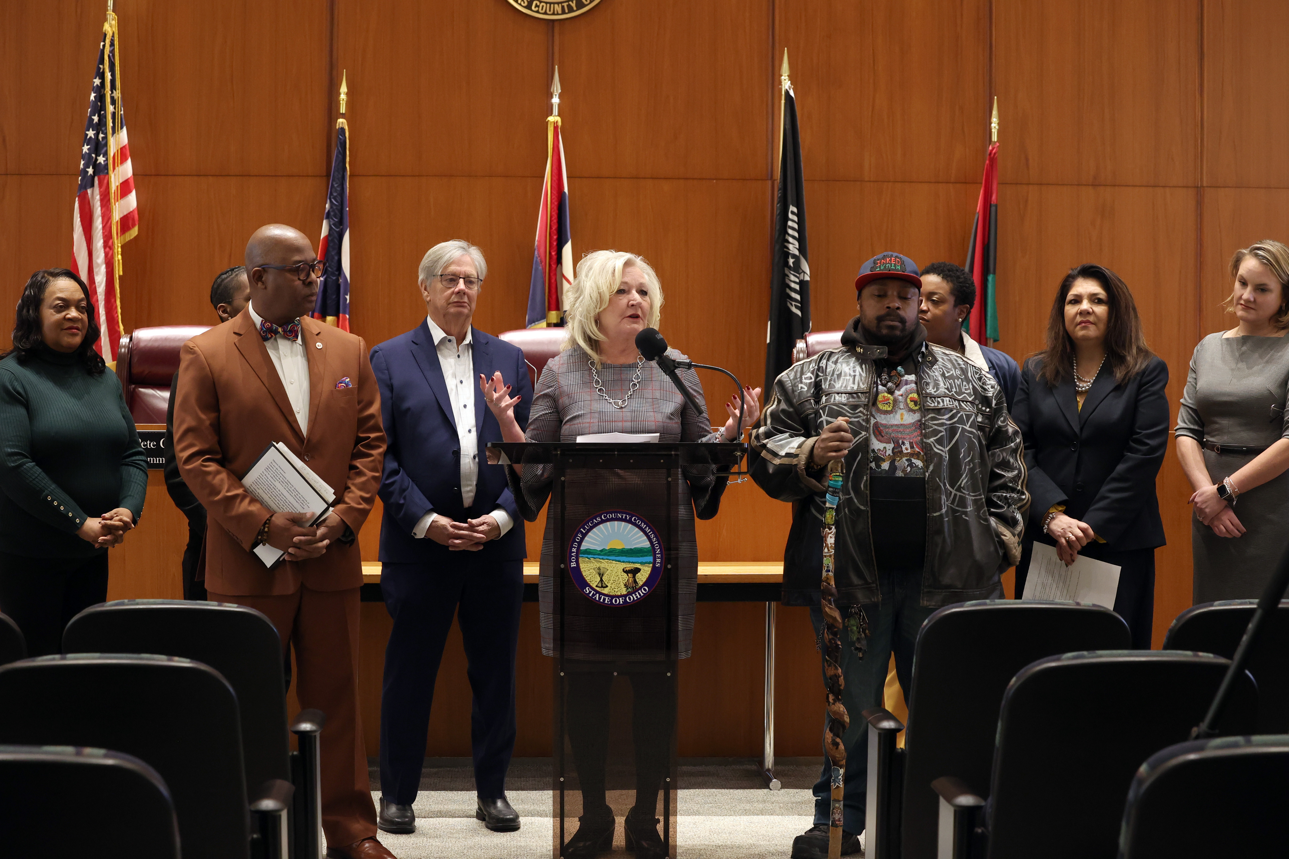 Commissioners Lisa A. Sobecki, Pete Gerken, and Anita Lopez spoke at a press conference before the flag-raising itself alongside Toledo City Councilwoman Dr. Brittany Jones, Brother Washington Muhammad of CSRN, NAACP Toledo Chapter President Darlene Sweeney-Newbern, and Olivia Holden, Executive Director of ASSETS Toledo, to highlight the significance of the Pan-African flag and detail the importance of celebrating Black History Month in Lucas County. Jodie Summers and Ron Wells, Jr. performed spoken word.